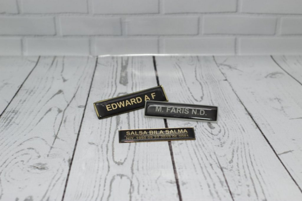 Papan Nama yang biasa dikaitkan di kain baju bagian dada kanan, bertuliskan nama, bisa juga jabatan serta NIP. Warna tulisan bervariasi, ada warna emas dan warna putih.